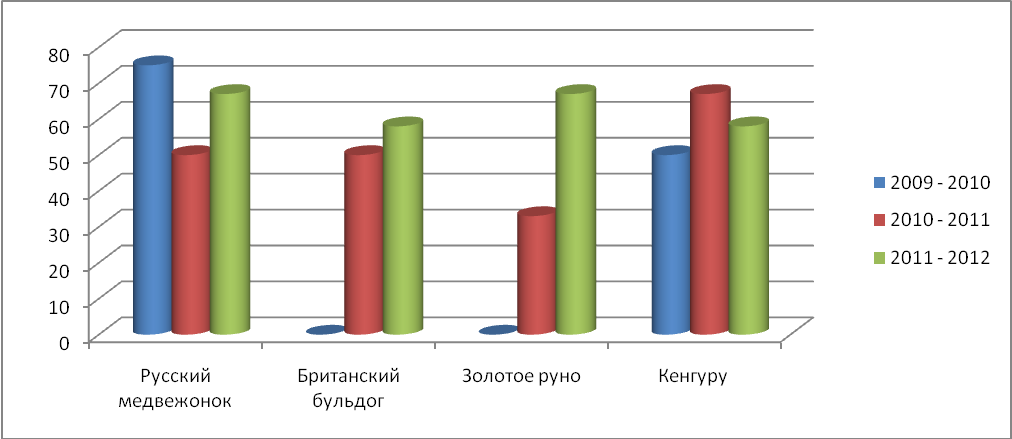 Таким образом, позитивная динамика уровня обученности моих учащихся за последние три года очевидна. 2. Позитивная динамика высокого уровня обученности учащихся за последние три года Высокий уровень обученности детей данного класса позволяет им результативно участвовать во всех школьных мероприятиях, а также конкурсах различного уровня. Так, например, учащиеся 4- го класса в текущем учебном году (2011 – 2012 учебный год) приняли активное участие в школьных предметных олимпиадах с целью совершенствования знаний по учебным предметам, а также выявления победителей для участия в районном туре. Олимпиады